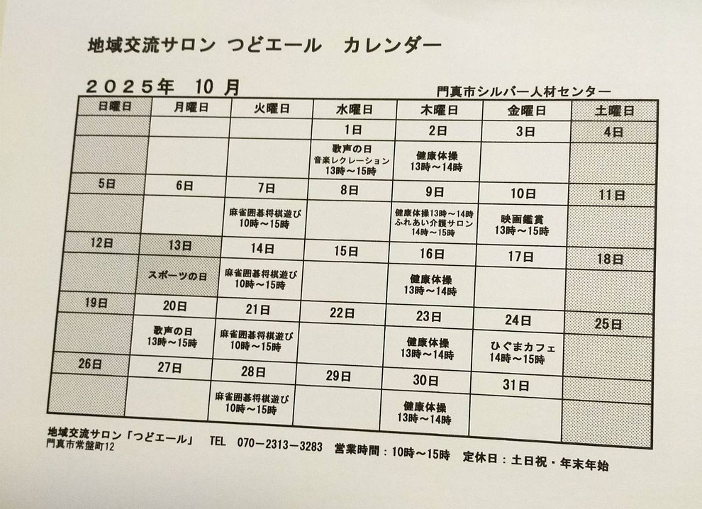 歌声の日、健康体操、カフェ、映画鑑賞などいろいろあります