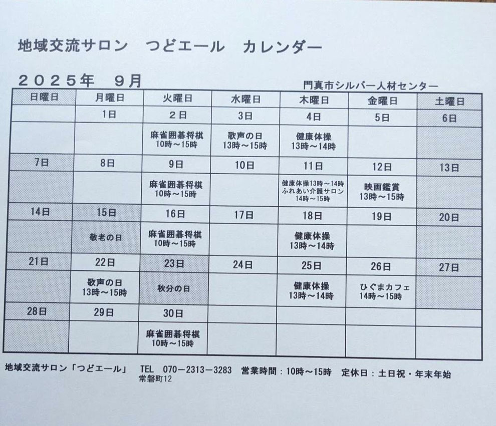 20日 8月 2025 [つどエール」9月分の予定 「つどエール」の9月分予定です 歌声の日、健康体操、カフェ、映画鑑賞などいろいろあります どしどしお越しください まってまーす 8月分など詳しくは こちら tagPlaceholderカテゴリ: